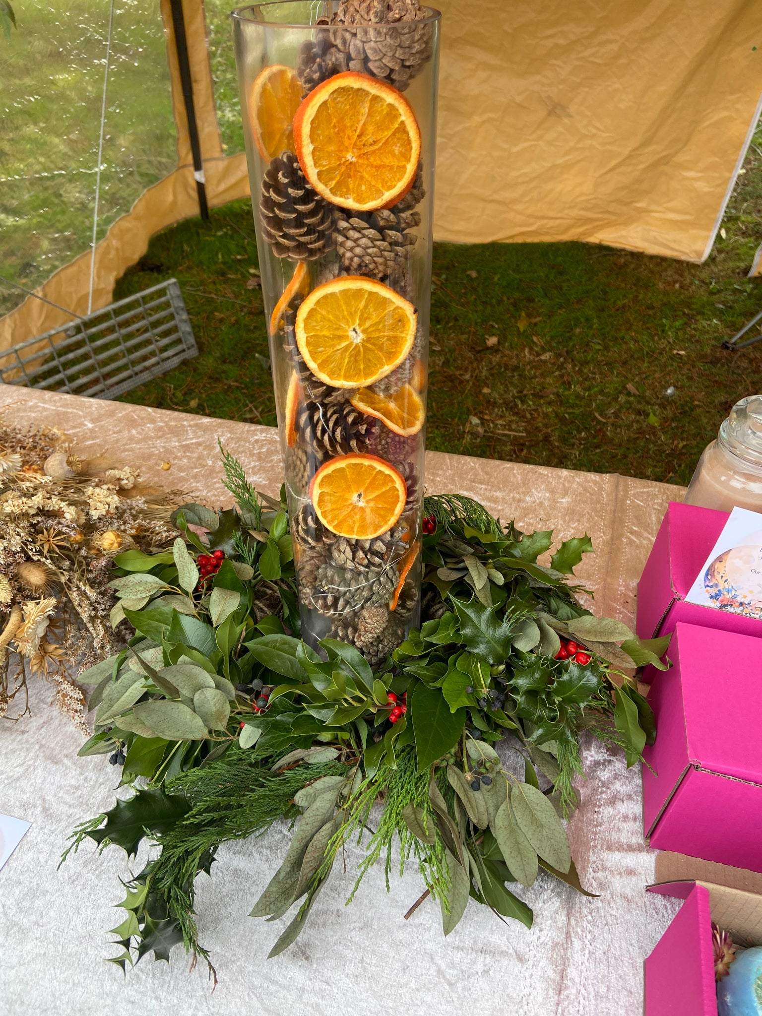 Details: A beautiful 100% compostable wreath. Natural willow ring, lined with moss and styled with fresh foliage including holly, Ivy, bay, conifers & eucalyptus. Large tubular vase center filled with fresh pine cones and battery lights.