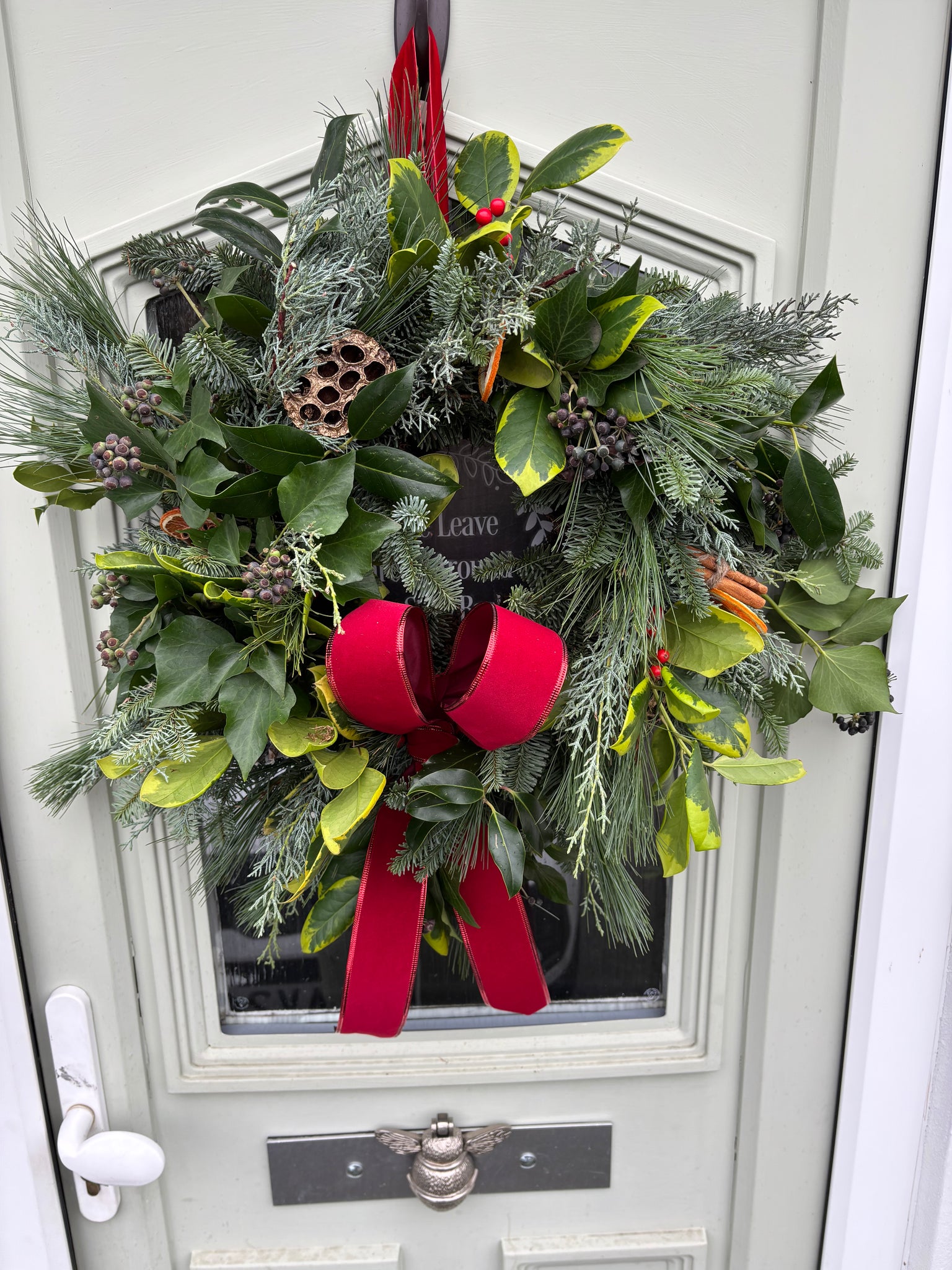 A beautiful medium/large wreath to adorn your front door or anywhere you wish to display. Made from willow & greenery picked on the farm - a mixture of firs, pine, holly, ivy & more. Decorated with cones, cinnamon, dried fruits. All beautifully finished with a choice of luxury ribbon.
